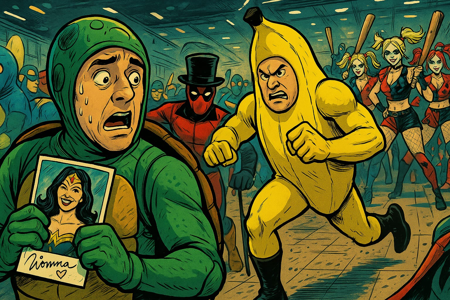 It seems you didn't pay attention to the assignment details. These are supposed to be life or death stakes and it's not clear whether the banana intends to murder the turtle here. You're also supposed to be showing, not telling. You wasted half your words on pop-geek references and little on descriptive action. And you're a mentor? 😬