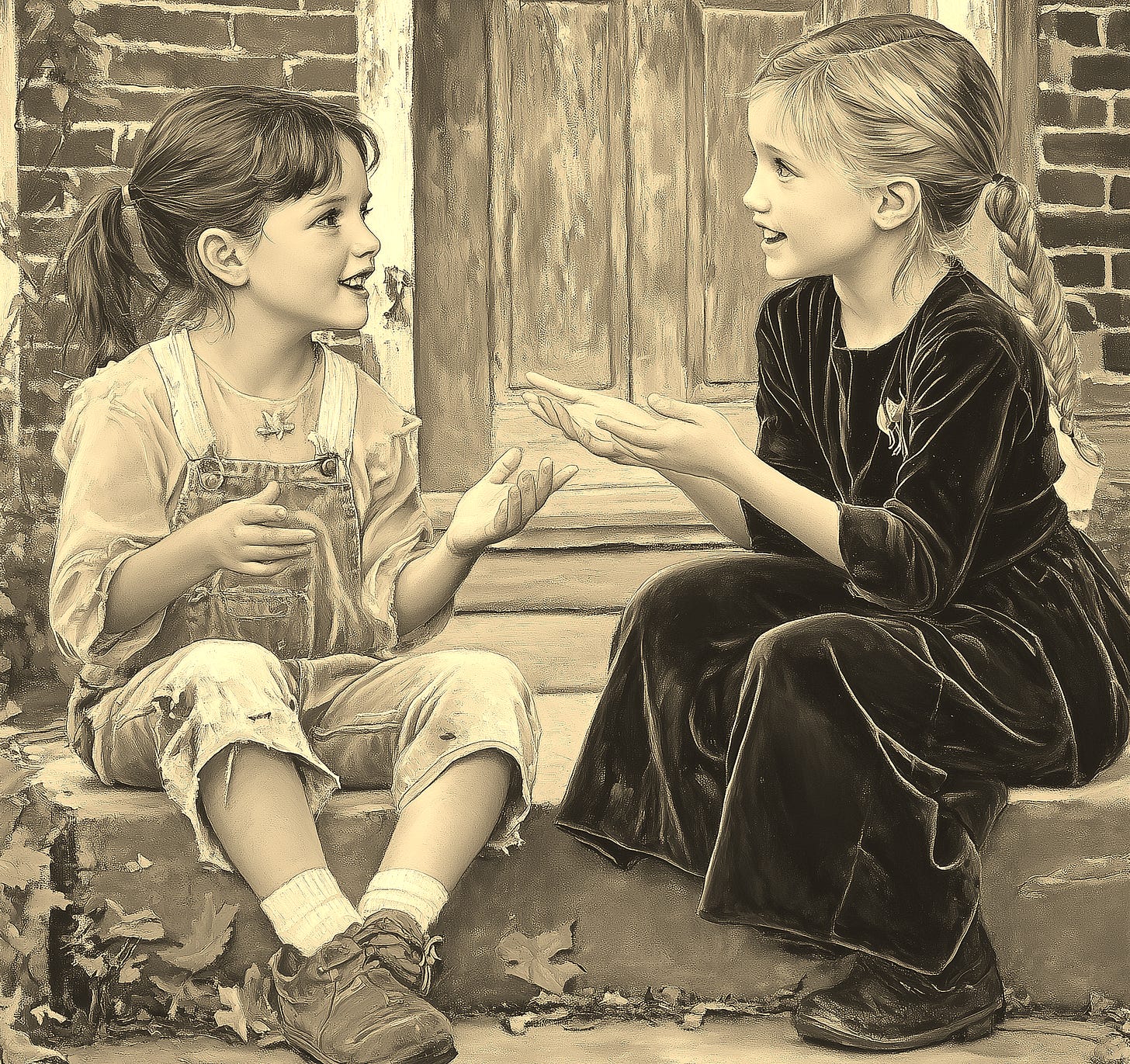 But her voice drops—almost a whisper. “When school started again that Fall, I looked for you. I hoped we could play again. But you were… sad. They told me your father died, and they said I should just leave you alone.”