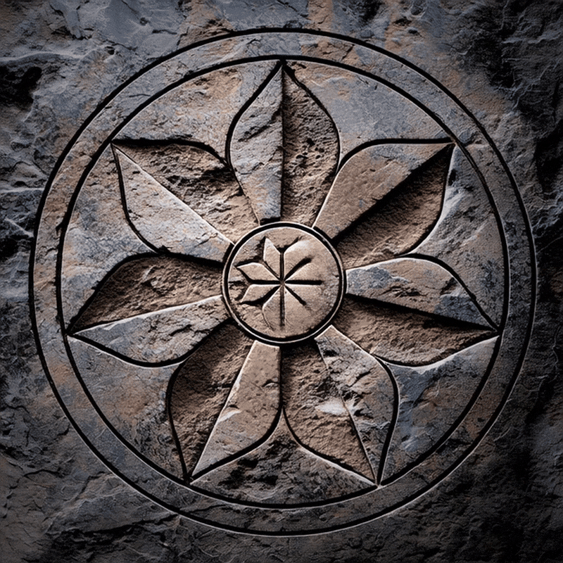 The stone door towers over me, wide as I am tall. At its center, there’s a carving: an encircled flower with seven petals, each curving to a point, and split along the vein. At the heart lies a symbol made of four wedge-shaped lines crossed like jackstraws.