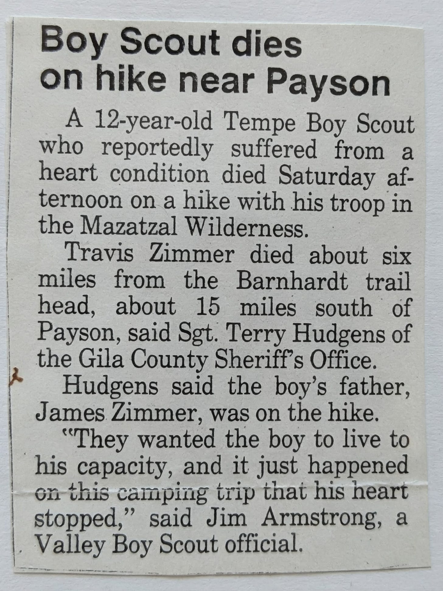 After setting up my tent at the campsite, I found myself in a circle of other Boy Scouts as our leaders informed us that some day hikers had passed a man with a young boy who’d died on the trail. Travis’d had a stroke—the elevation too high, the strain too much on his broken heart, my father’s attempt at CPR a failure.