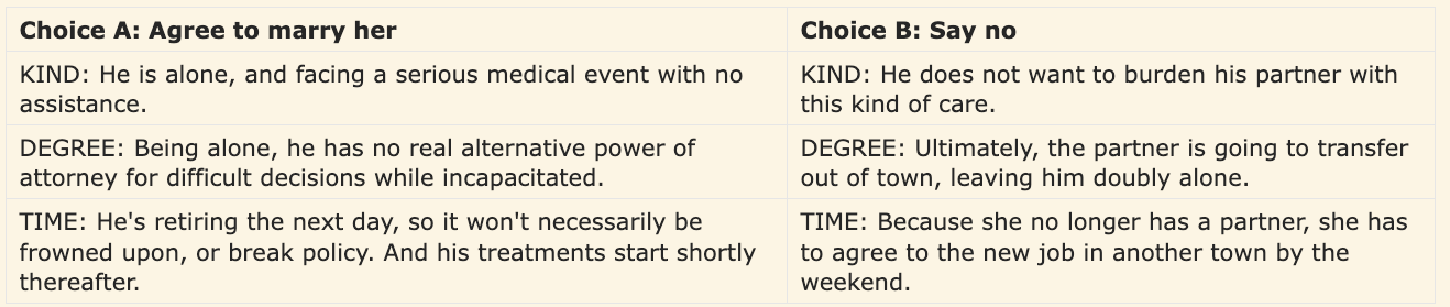 The antagonist is a EMT, and she is asking her partner to marry her, because she just found out he has terminal cancer and will be dealing with it alone after he retires the next day.