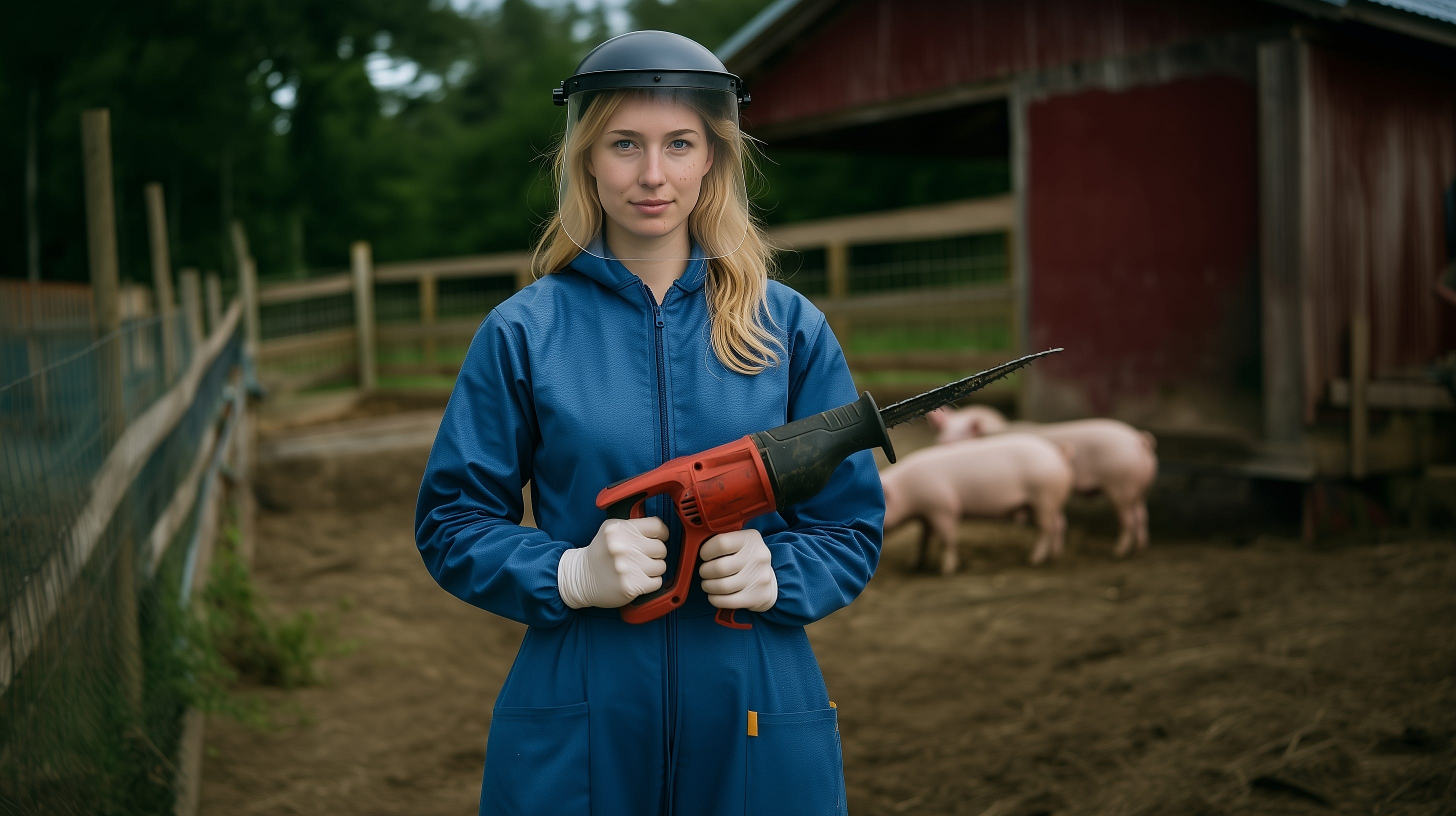 Bridget's blue overalls are crisp and clean. She tightens her gloves. Grabs the sawzall and gives it a whir.
