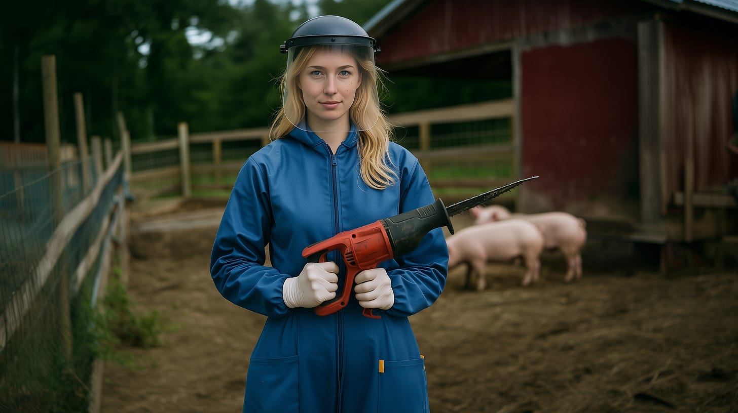 I grin, taking the saw in one hand. "Great." I toss a hook shot with the other. The head drops into the wheelbarrow. "You can feed the pigs."