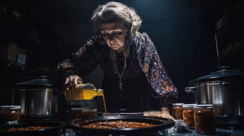 Dozens of slow cookers hummed along two folding tables, and Francine tiptoed between them, checking each nametag. She stopped at a cooker with a blue display, set the lid to the side, and pulled a dropper bottle from her handbag. She opened it and poured a glug of liquid into the crock.